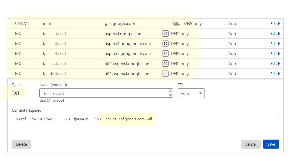 1.יש להכניס את הרשומות מצ"ב (MX ו SPF)כמתואר בתמונה.